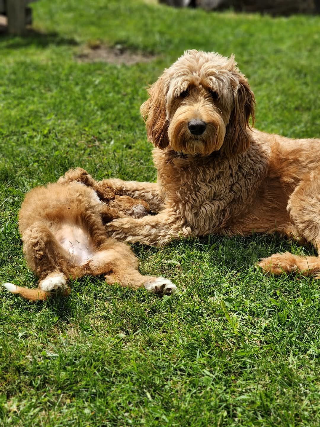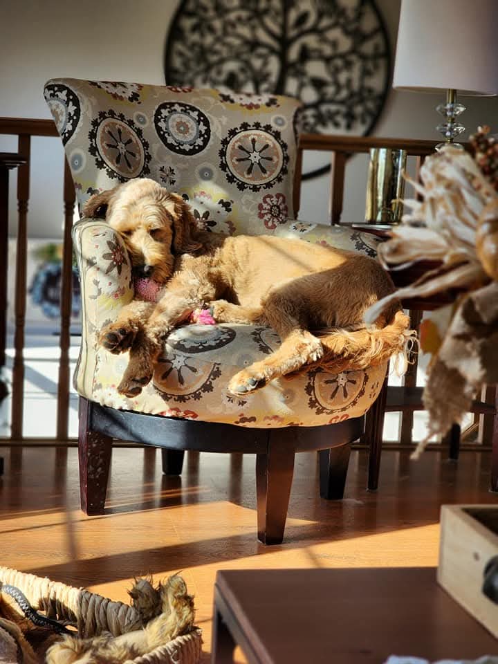 After a C-section to deliver her puppies, our trusted reproductive veterinarian assured us it was safe for Briar-Rose to have another litter. However, at Doodles of Pigeon Creek, our dogs’ health always comes first. We decided to retire Briar-Rose to ensure her long-term well-being. She now lives her best life with a wonderful family and her beloved sister, Violet. Briar-Rose is truly living the dream—she even gets to spend her winters as a snowbird in sunny Florida!
